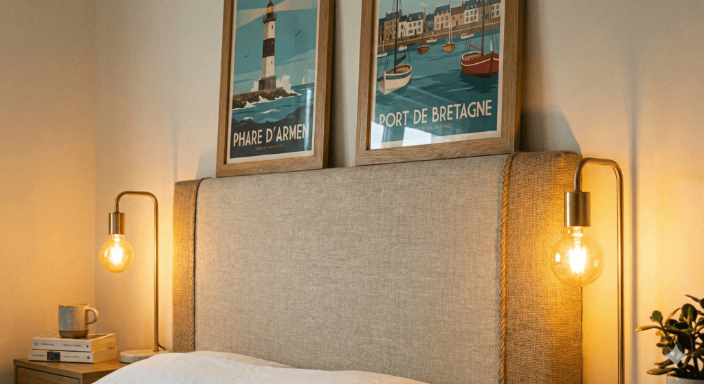 Optez pour des affiches graphiques encadrées (très tendance) représentant les lieux emblématiques : la Citadelle de Port-Louis, l’Île de Groix ou les grues du port de Lorient. Cela habille les murs et ancre votre bien dans son territoire avec élégance.